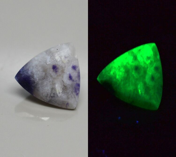 Morado Opal 1.65 ct Trillion Cut Mexico T1780 Morado opal Is a type of common opal that show an interesting fluorescence either at long,medium at short waves UV light. It's fluorescence is cause by purple fluorite,while the white area is hyalite contaning traces of uranium.Full description in the Gems and Gemology of Spring 2012. Is also called Royale Blue or Purple Mexican Opal. So far hase been cut in cabochons but not as facetted stone. The location is central Mexico |