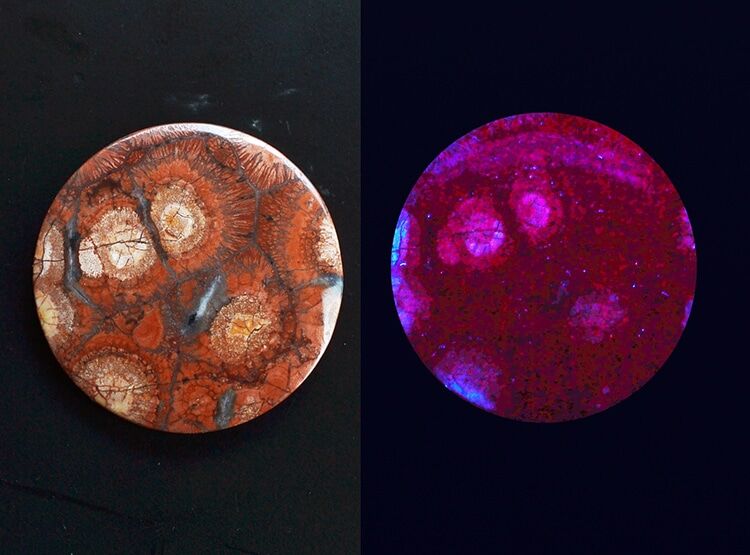 Rhyolite Bird’s Eye 37.70cts Round Shape Cabochon 34.00mm Fluorescent Gem H6 Mexico, Y10070