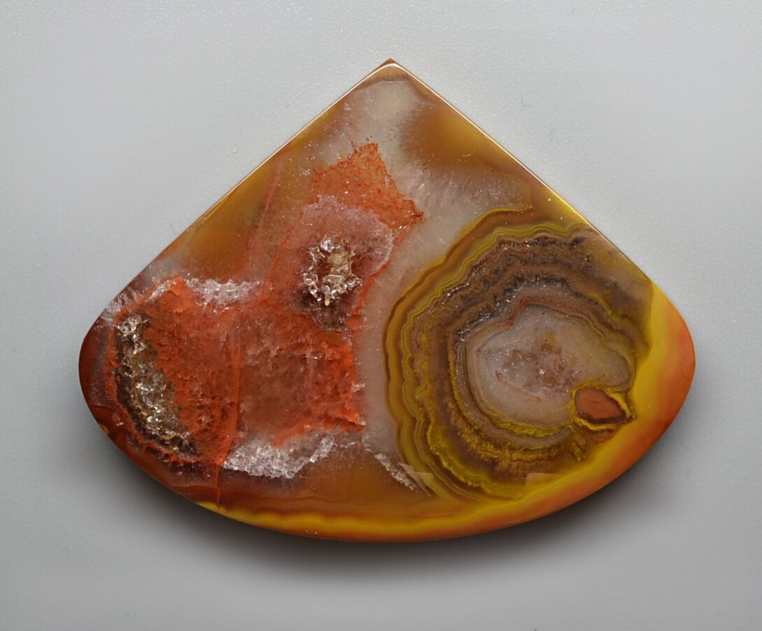 colors are red, orange and yellow with often quartz Druzy in the central portion.