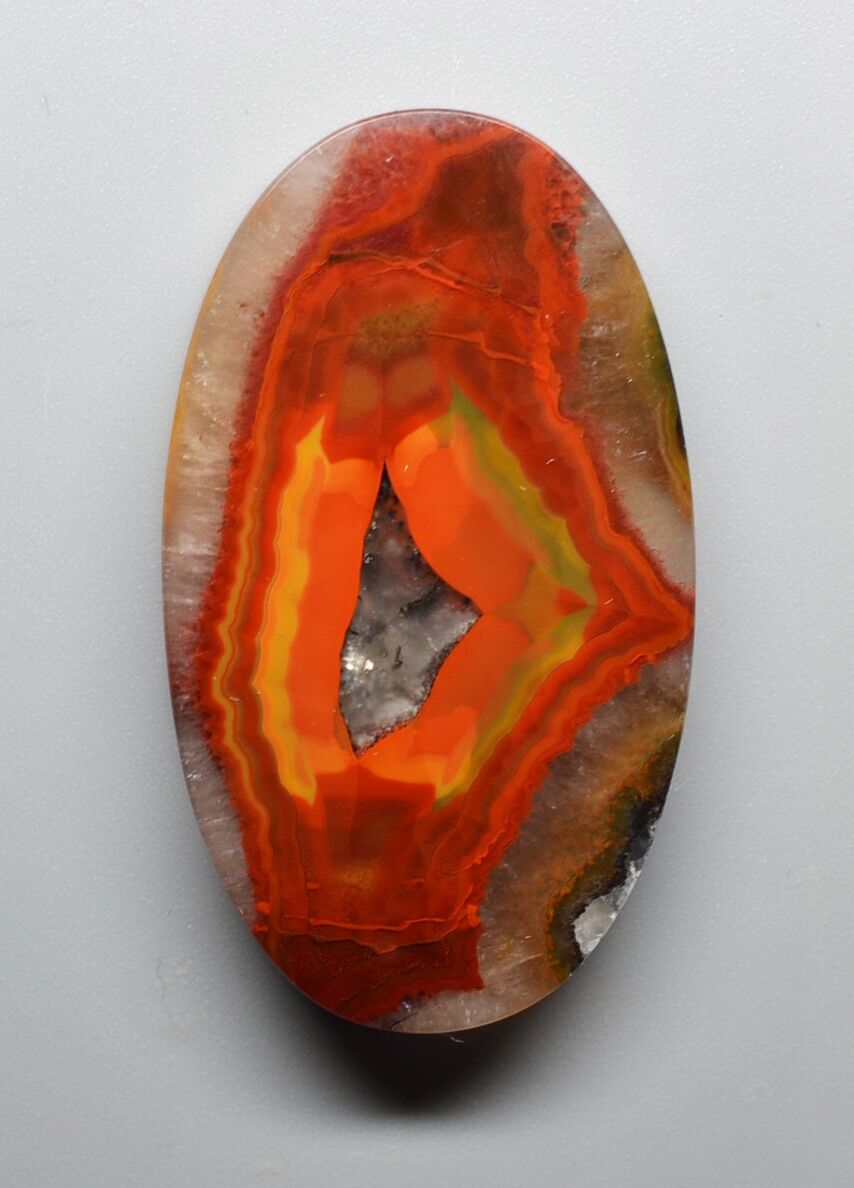 colors are red, orange and yellow with often quartz druzy in the central portion.